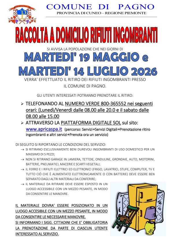 Si avvisa la popolazione che nei giorni di Martedi 19 maggio e Martedì 19 luglio 2026 verra’ effettuato il ritiro dei rifiuti ingombranti presso il Comune di Pagno.
